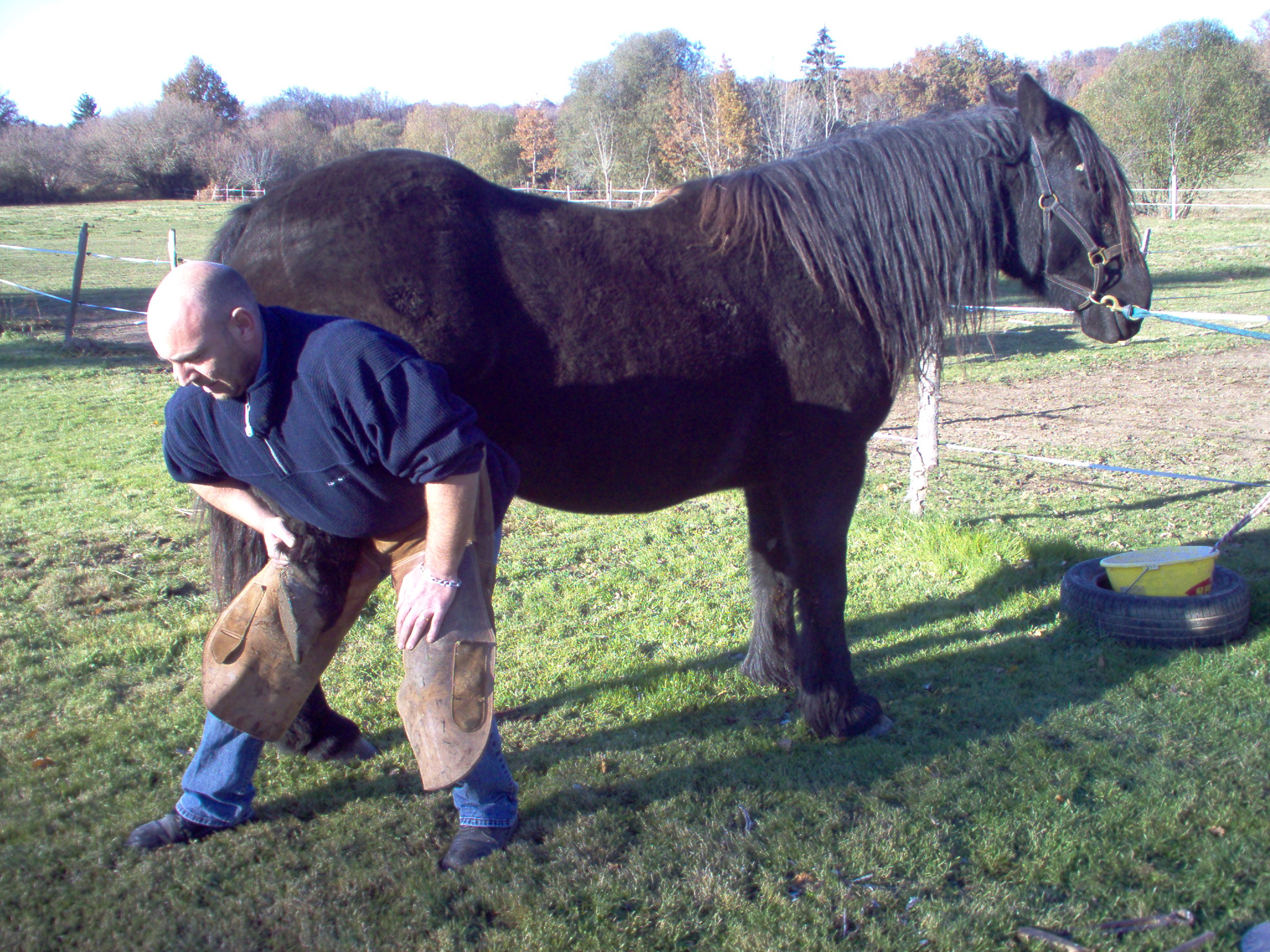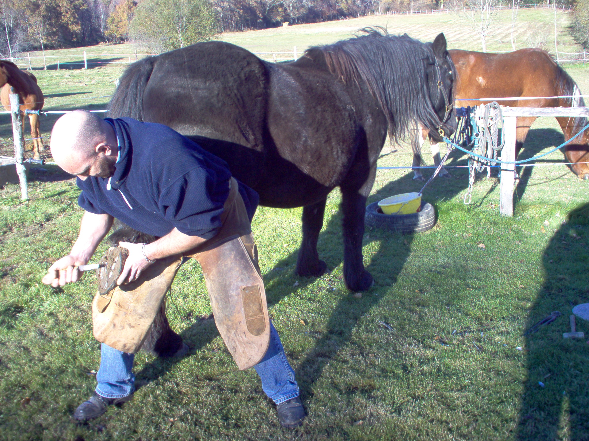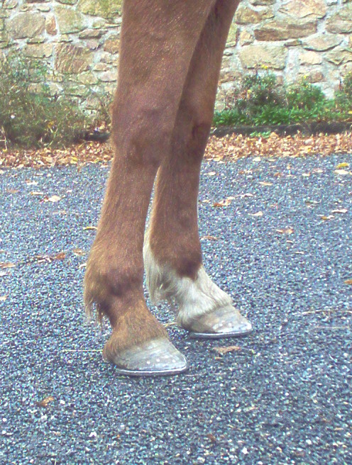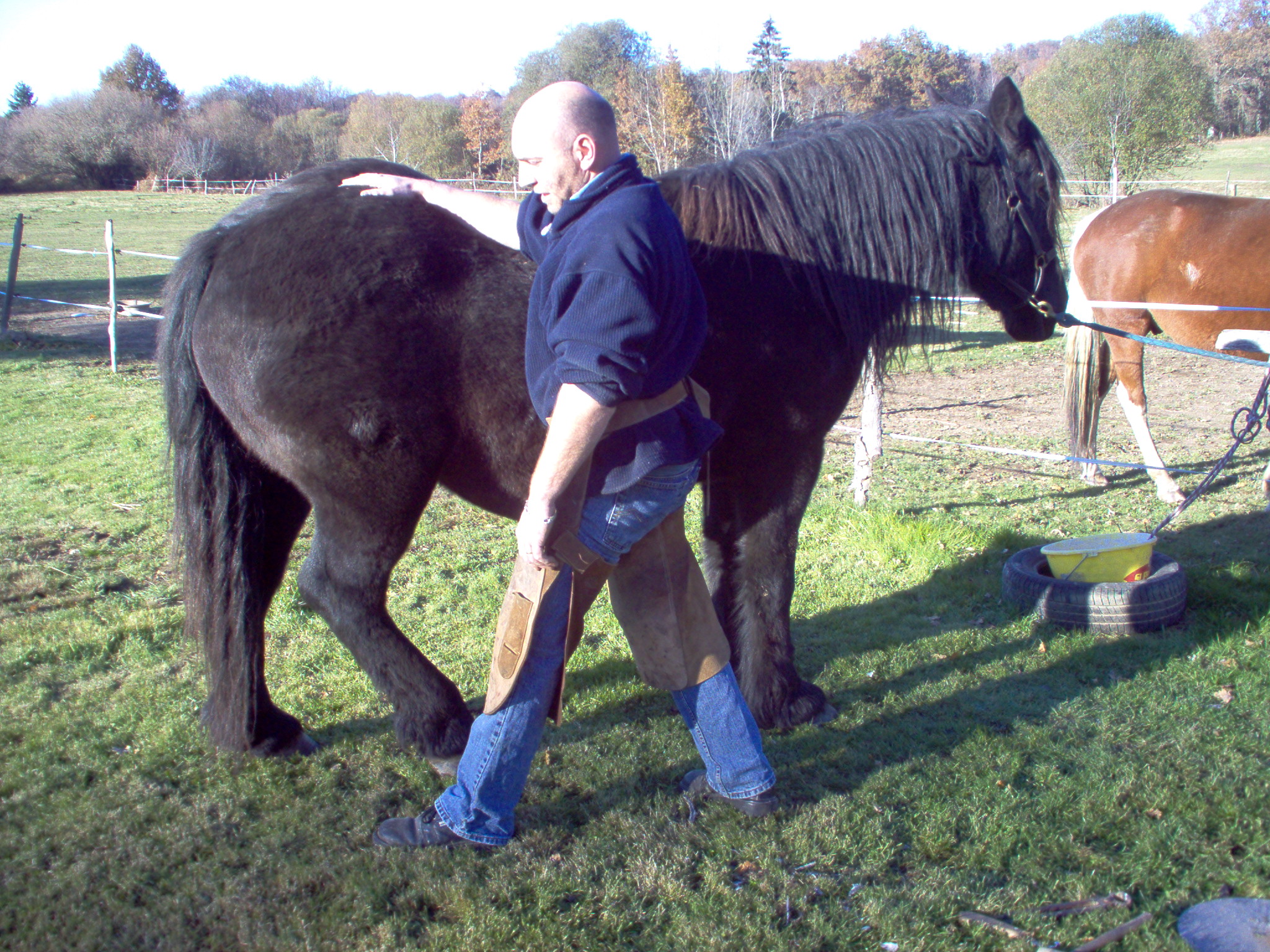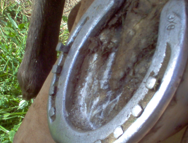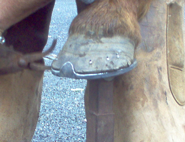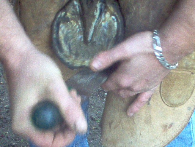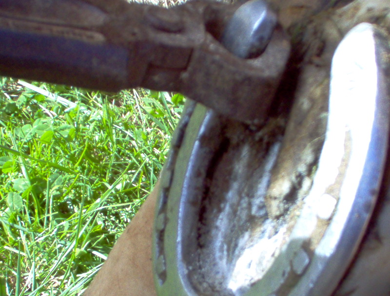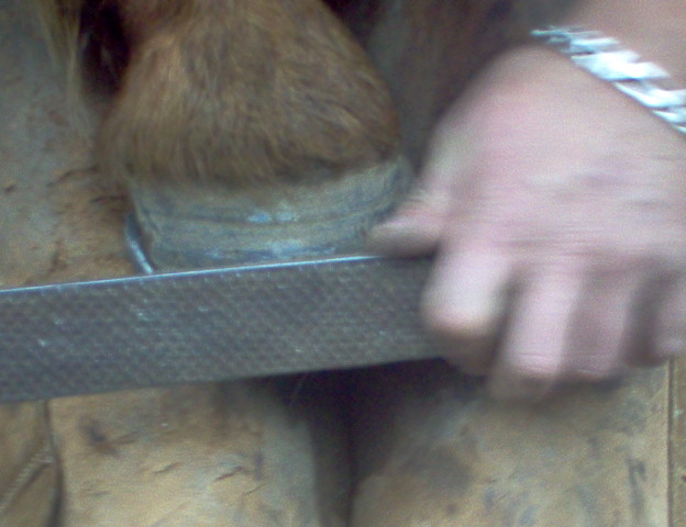 n'oubliez pas de controler avec la râpe à différents endroits du pied, en biais ( dans les deux sens )comme montrer sur la photo, mais aussi au niveau des talons ..; Vous voila maintenant avec un cheval qui a des fourchettes bien tailler et des lacunes degager et bien nettoyer, si les fourchettes ne sont pas elastique (quand vous appuyer avec le doigt ça doit etre assez elastique), dans le cas de fourchette trops dure et seches, vous pouvez appliquer de l'huile de laurier ou bien de l'onguent, par contre si elles sont trop molles il faut dans ce cas leurs appliquer du goudron de norvege , mais attention toujours a ne pas en mettre des tonnes, un leger passage de pinceau suffit amplement,...;bientot un autre photo reportage sur le parage ...
