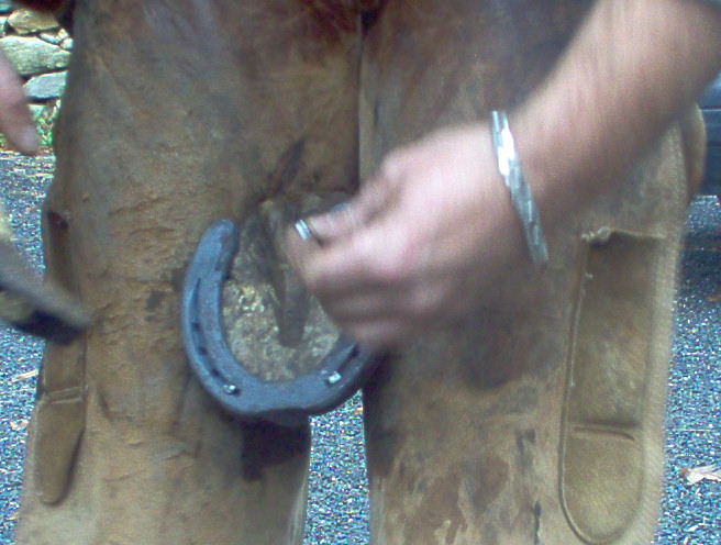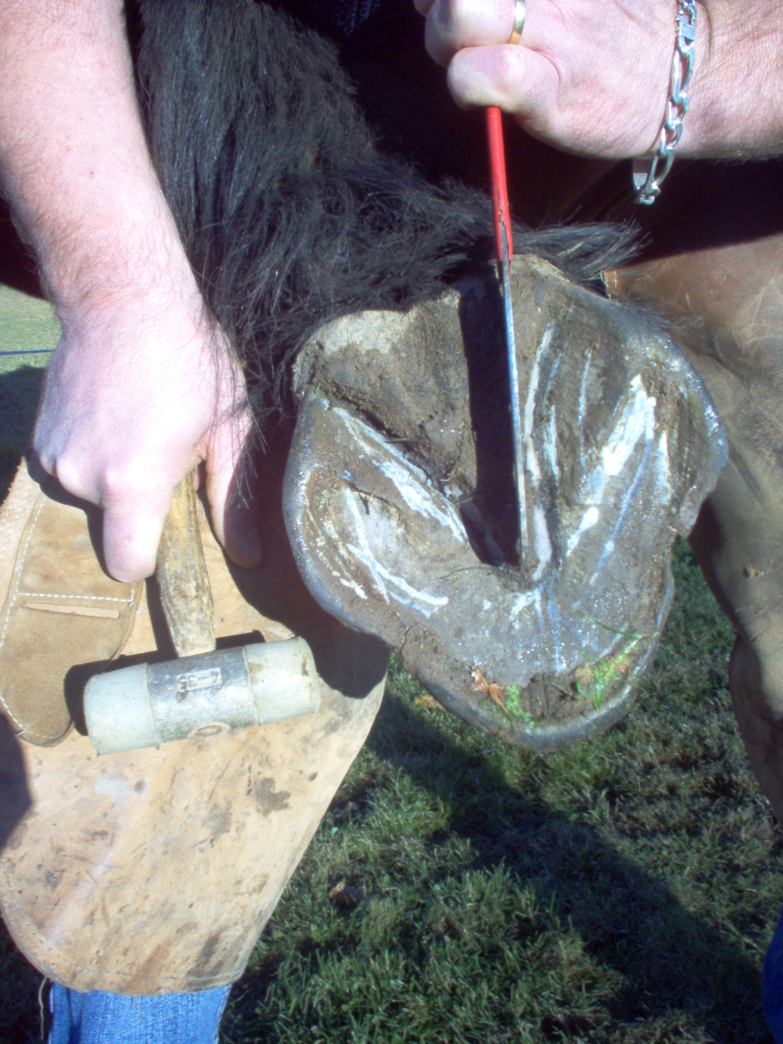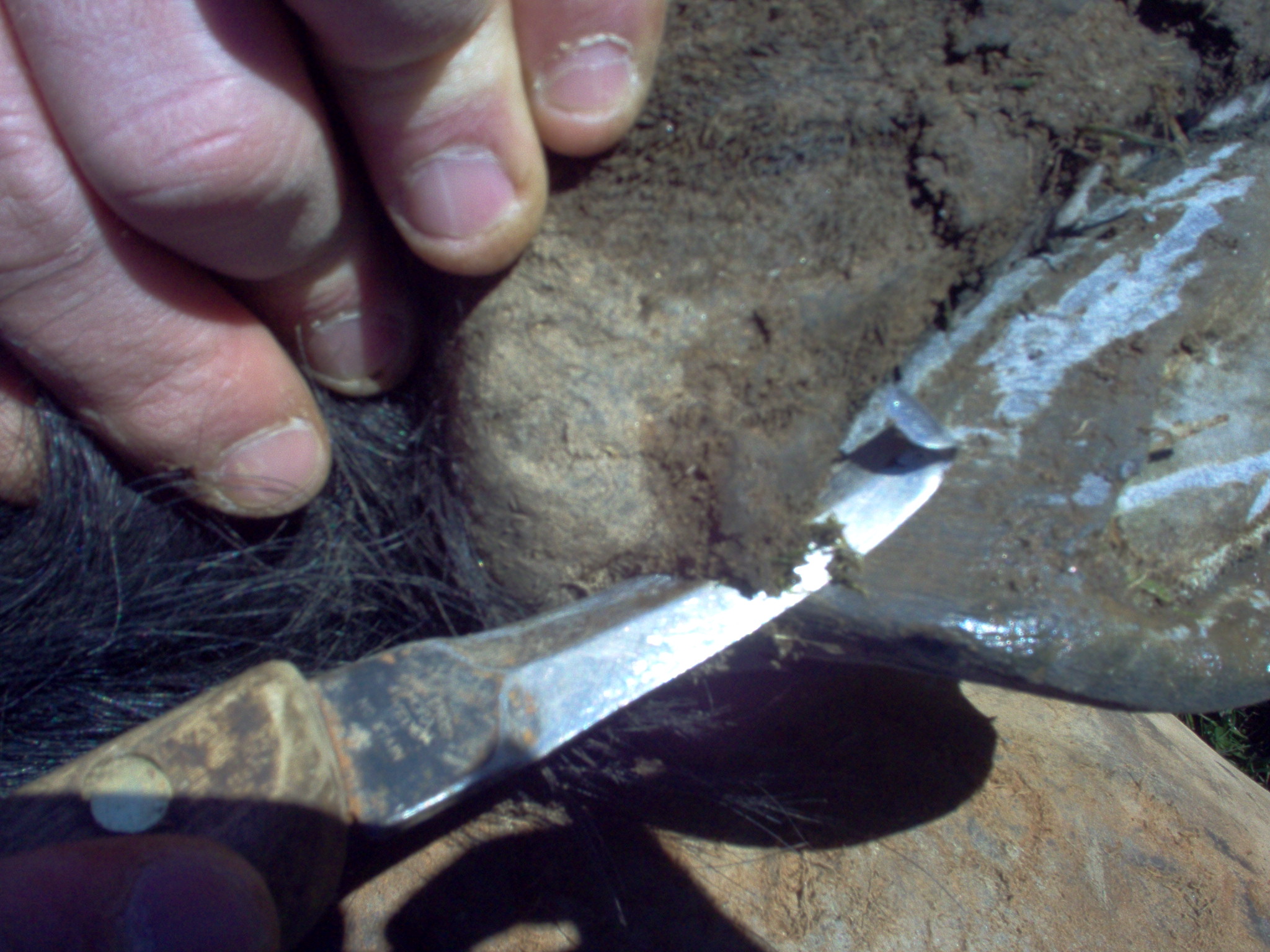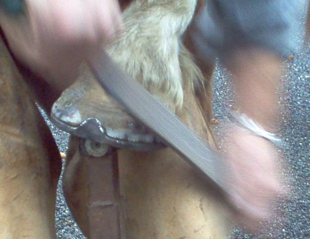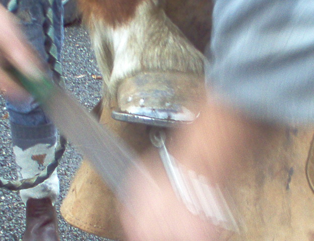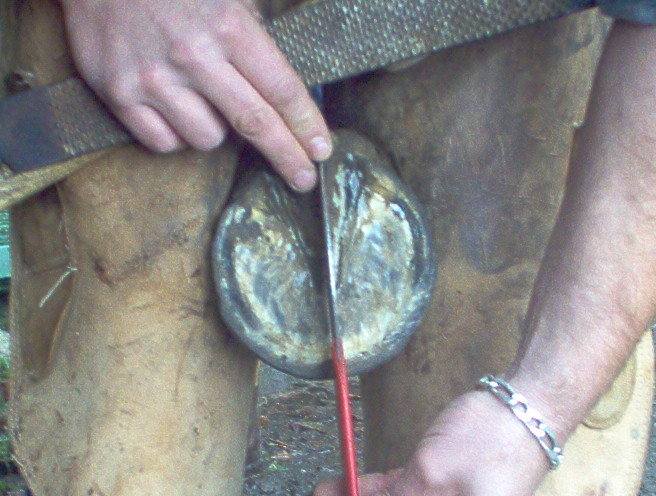 pendant ce temps ont va preparer le pied a recevoir le fer et surtout le pinçon, ont va donc réaliser une encoche dans le pied du cheval au niveau de la pince, ont commence par prendre le milieu du pied entre les glomes et la pointe de la fourchette, (la fourchette donne la direction de la troisieme phalange appelée aussi os du pied)