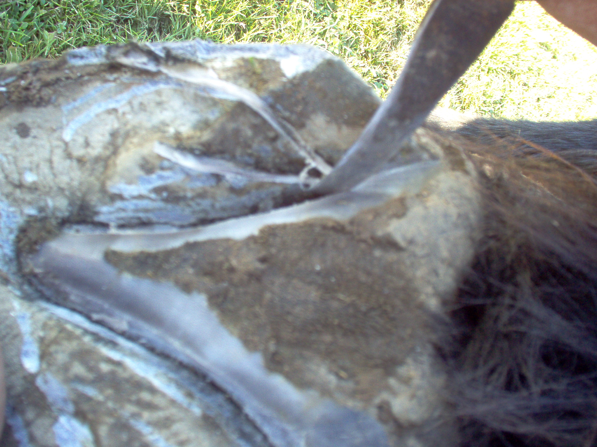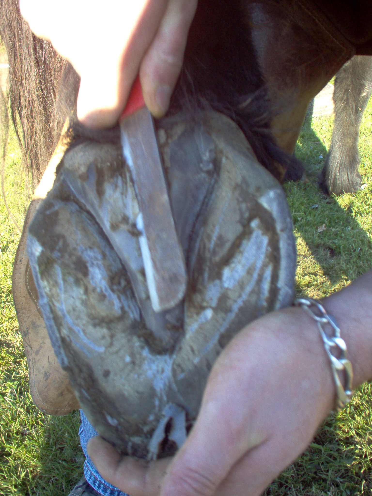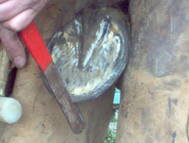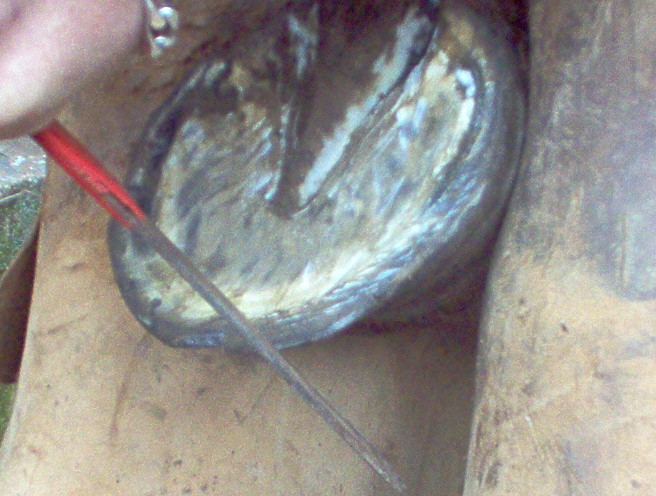 maintenant que l'ont c'est occupé des lacune lateral ont va s'interresser a la lacune mediane , ont commence par la gratter legerement avec la reinette et ensuite ont va retirer toutes les parties necrosé ou abimé de cette lacune a l'aide du rogne pied que l'ont utilisera comme un couteau..attention de ne pas aller trop loin en profondeur, il y a de la vie la dessous, si vous ne connaisez pas encore les parties internes du pieds du cheval , allez donc refaire un tour sur l'article qui vous parle de la description interne du pied...