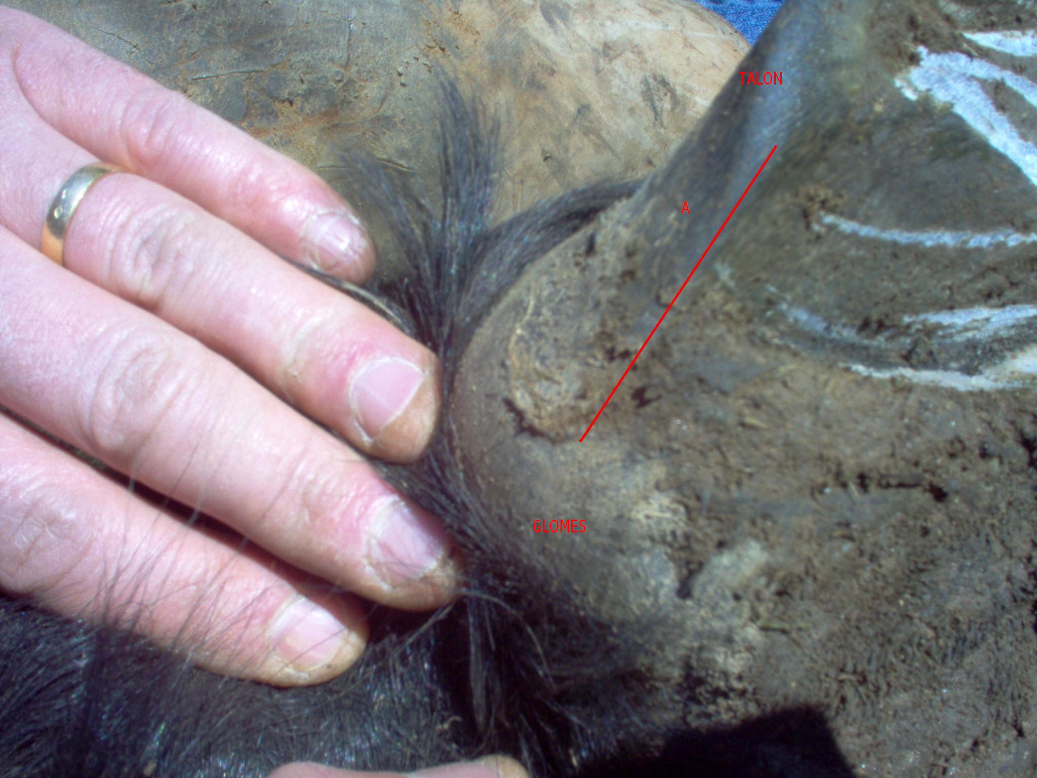 il faut couper l'excedant de la partie posterieur de la fouchette jusqu'à la rencontre de la jonction entre le talon et les glome..sur la photo precedente la ligne en rouge montre le chemin que suis le talon depuis sa pointe jusqu'à sa naissance avec la jonction, talons-glome-fourchette. pour inciser cette partie ont utilise son rogne pied ou si vous avez peur de trop couper commencer donc avec la reinette..