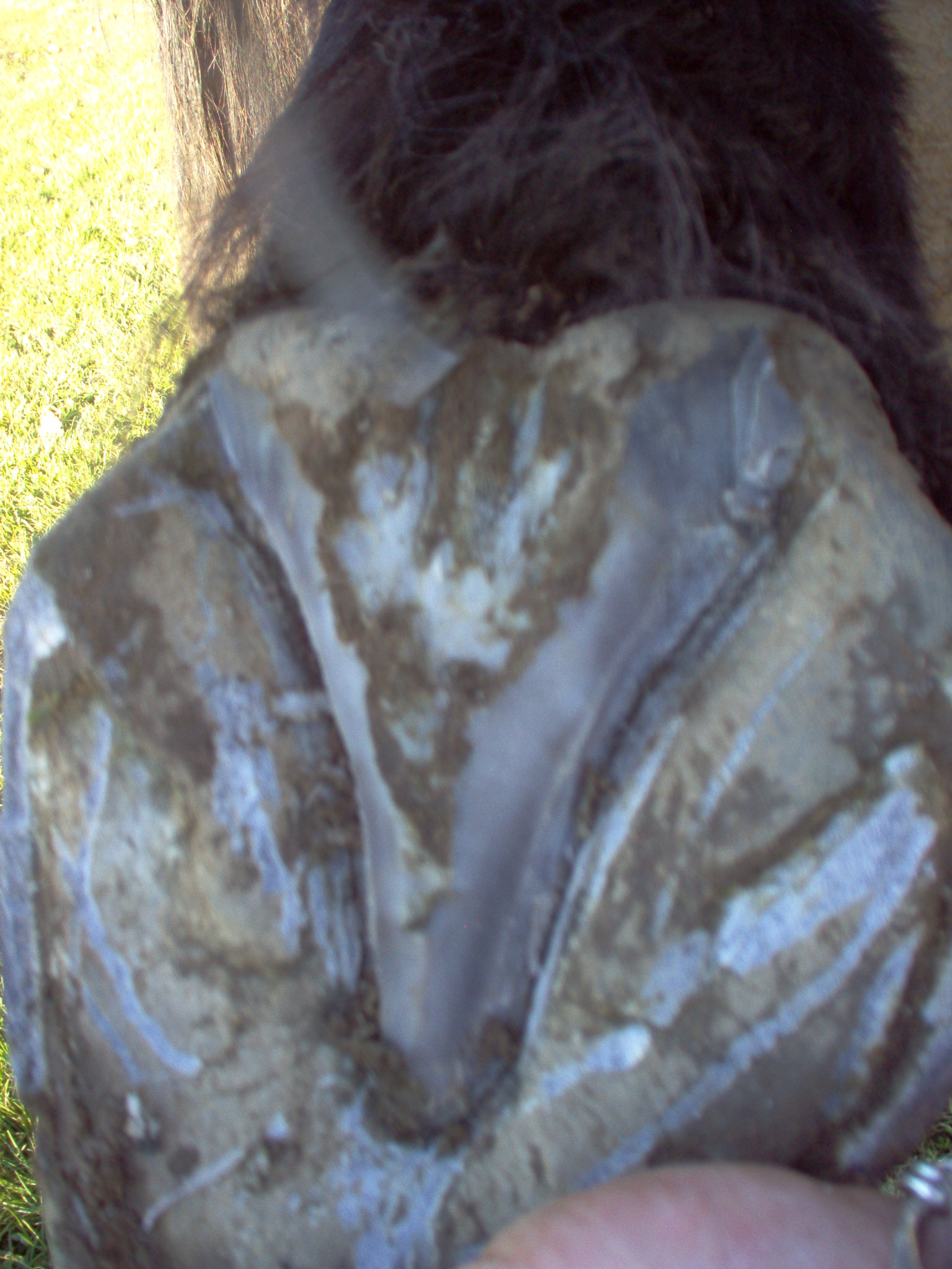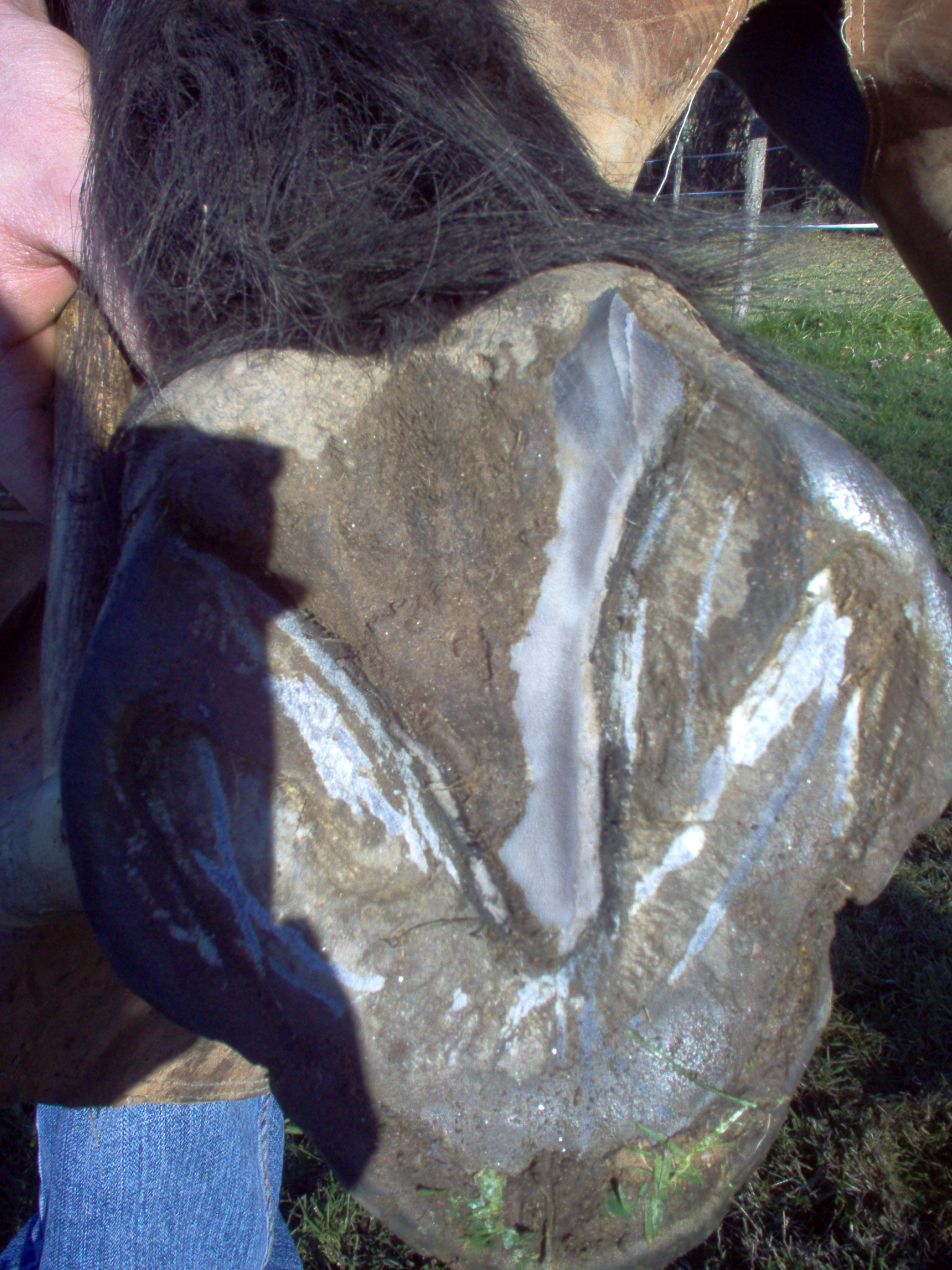il est trés important de bien nettoyer ces lacunes, les parties qui sont sombres sont des parties necrosé qu'il faut enlever au risque de voir la fourchette s'abimer , quand la fourchette pousse les lacune se retrouvent cachées en desous et tout les germes aussi, c'est souvent du au mauvais entretien de ces lacunes latéral que surviennent dans la majorité des cas des problemes de fourchette pourrie ou en mauvais état..pour nottoyer ces lacune ont va utiliser la reinette, en partant de la pointe de la fourchette ont va simplement remonter jusqu'au niveau des talons , attention, la reinette est un outil tres coupant , alors n'appuyer pas comme des sauvages, faite le en plusieur fois si vous n'en avez pas l'habitude et attention a vos doigts...